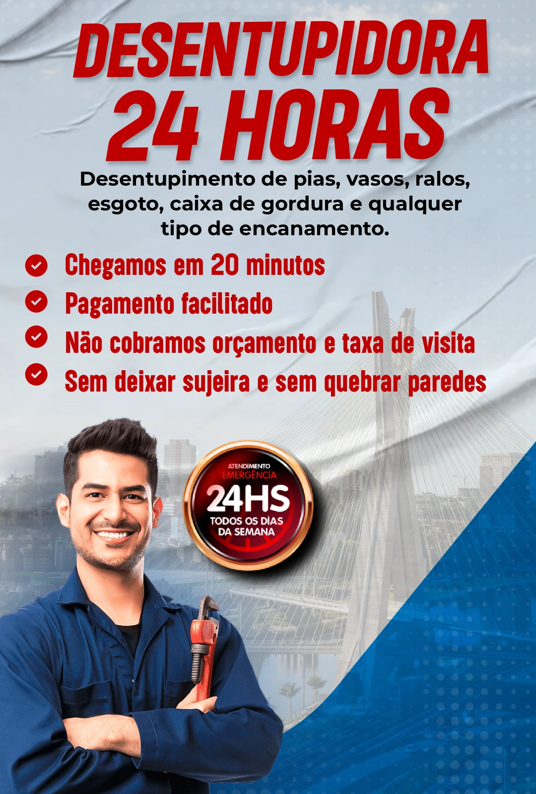 Atendemos 24 horas por dia, 7 dias por semana, pois entendemos que problemas de entupimento podem ocorrer a qualquer momento.